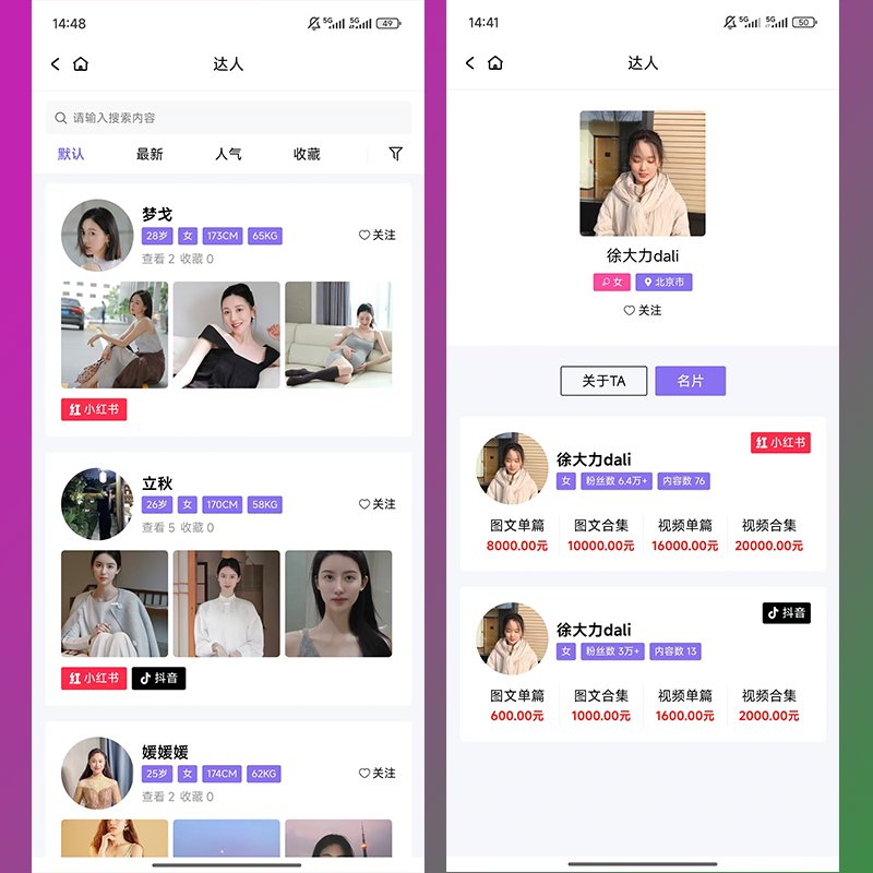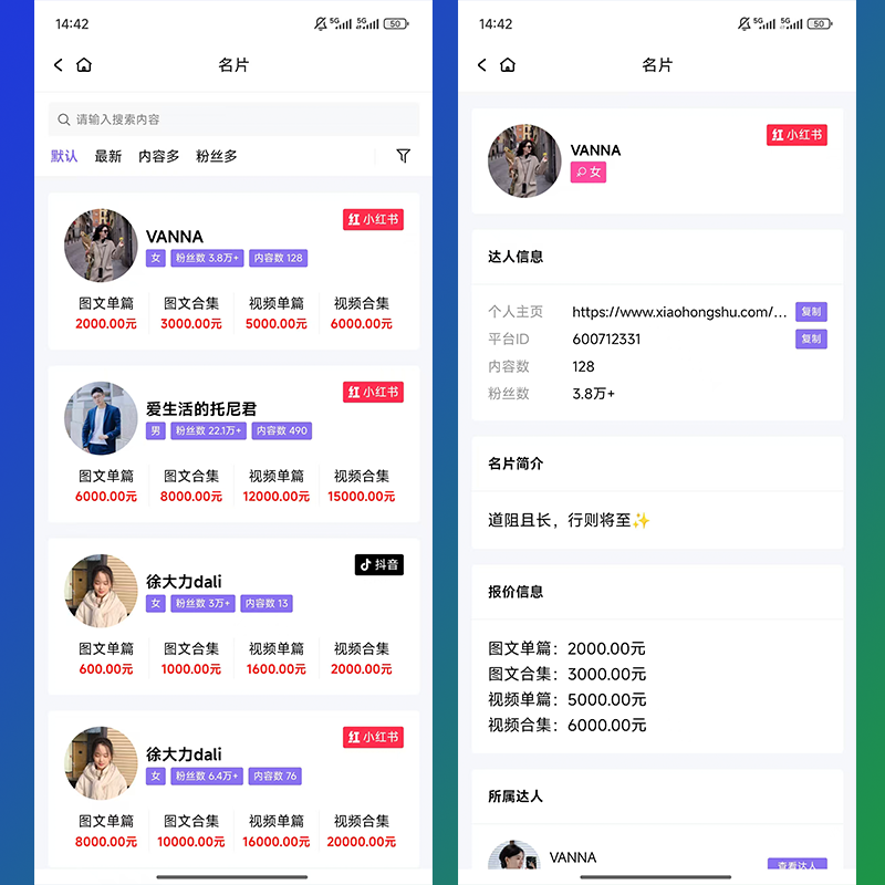 一个达人,可以有多个名片,如:小红书、抖音名片等