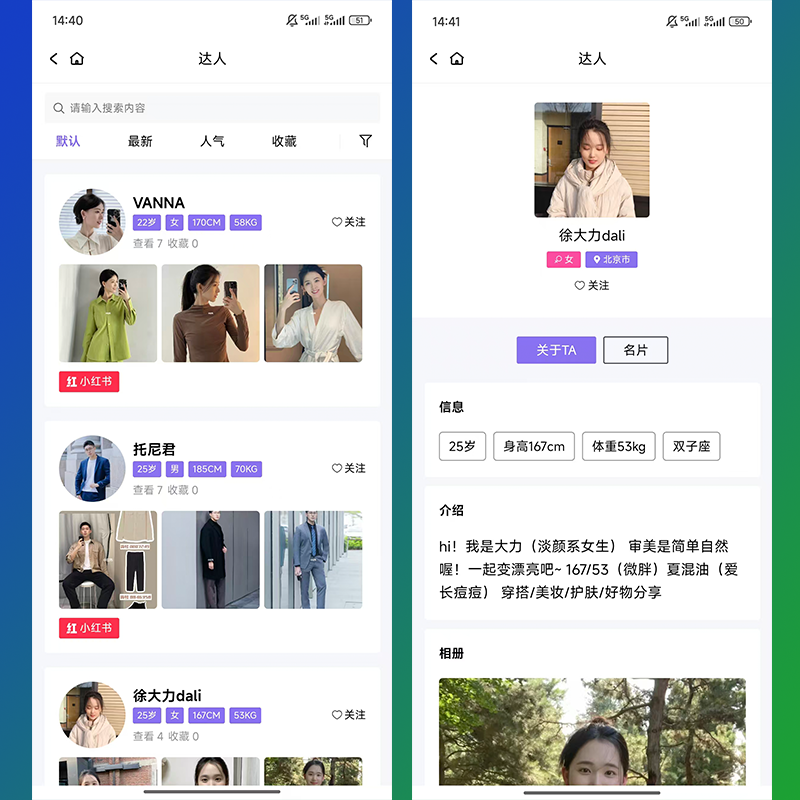 达人可上传自己的相册,便于商家通告合作